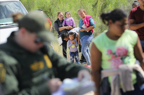 Central American asylum seekers wait as Border Patrol agents take them into custody near McAllen, Texas, on June 12, 2018. The families were then sent to a Customs and Border Protection processing center for possible separation. (John Moore/Getty Images)