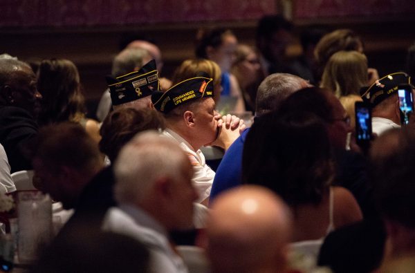 A veteran listens to President Donald Trump speak at the Salute to Service Dinner in White Sulphur Springs, W. Va., on July 3, 2018. (Samira Bouaou/The Epoch Times)Trump received a warm welcome from the festive crowd of veterans from all branches of the military, as well as renowned golfers such as Phil Mickelson and Bubba Watson. The Greenbrier is home to an annual PGA Tour stopover, which doubles as a military tribute.